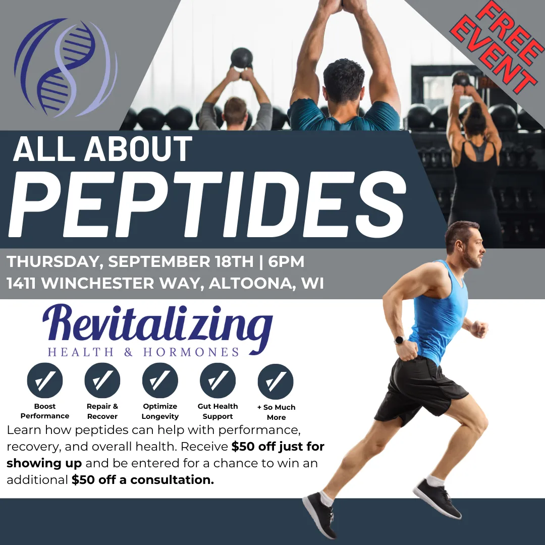 Yes — we’ll be diving into popular peptides like Sermorelin, Semaglutide, Ipamorelin, and more, as well as the cellular power of NAD+ therapy. Whether you're managing inflammation, healing from injury, chasing fat loss, looking to nab some gains, or fighting fatigue, this FREE EVENT is your chance to learn what’s working, what’s safe, and how to take action with expert support from Revitalizing Health and Hormones. Come hang out, get informed, and maybe even snag $50 off your consultation.