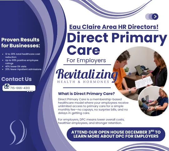 Are you a Chippewa Valley business owner looking for a smarter, more affordable way to provide healthcare for your team? At Revitalizing Health & Hormones, our Direct Primary Care (DPC) for Employers program is designed to simplify healthcare, improve employee well-being, and save businesses money — all while delivering a higher level of care.