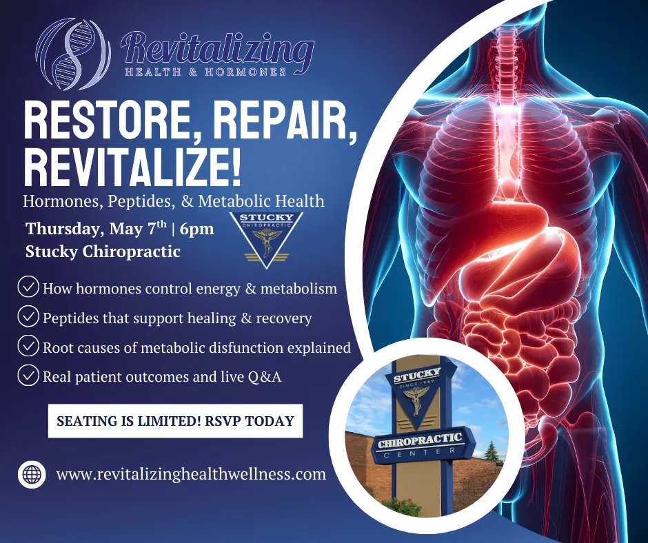 Join Revitalizing Health & Hormones for a special educational event, Restore, Repair, Revitalize: Hormones, Peptides & Metabolic Health, hosted at Stucky Chiropractic on May 7th. During this one-hour presentation, our team will break down how hormones, peptides, and metabolic function work together to regulate energy, recovery, inflammation, and overall health.